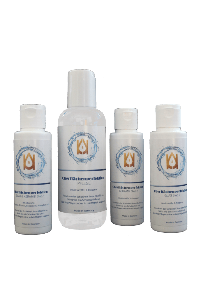 Mit unserer Permanentschutzserie können Sie verschiedenen Oberflächen (Glas sowie Keramik und Stein) behandeln und hierdurch zukünftig nicht nur Zeit bei der Reinigung sparen, sondern schädliche Reinigungsmittel verhindern.